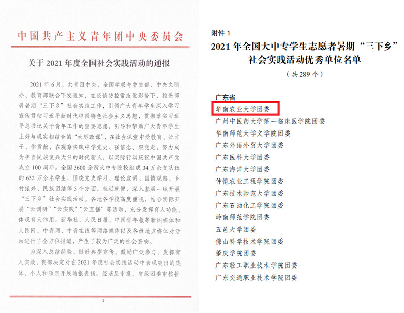 近日,团中央、团省委等上级部门总结通报了2021年大学生暑期“三下乡”社会实践成果。我校被评为2021年全国大中专学生志愿者暑期“三下乡”社会实践活动优秀单位,2个团队和8名师生分别被评为2021年广东省大中专学生志愿者暑期“三下乡”社会实践活动优秀团队和优秀个人。