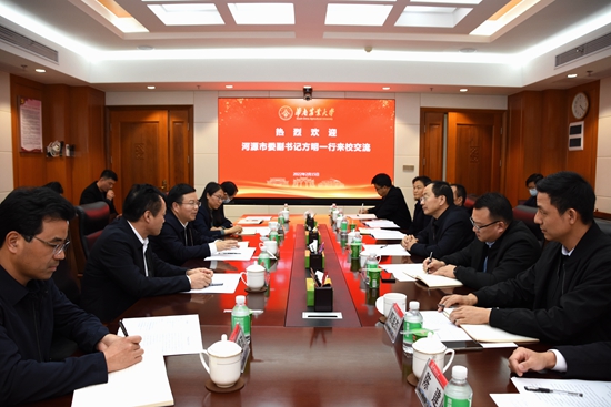 2月15日下午,河源市委副书记方明、副市长谢春艳一行6人来访我校,就深化校地合作推进乡村振兴事宜进行交流。学校党委书记王斌伟接待来宾并主持座谈会。