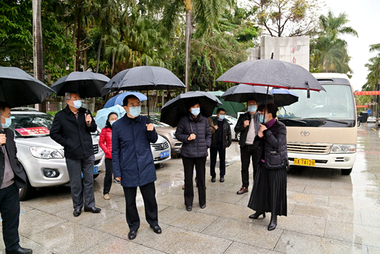 为做好2022年春季学期学生返校工作,2月19日上午,校党委书记王斌伟,校党委副书记、校长刘雅红,校党委副书记钟仰进,副校长杨运东一行来到学校西南门,实地察看学生返校工作情况,慰问一线工作人员及学生志愿者。