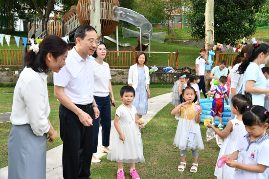 在幼儿园,王斌伟、刘雅红和小朋友们一起参加了“六一”游园活动,并与小朋友们亲密互动,为他们送上“六一”儿童节祝福。随后,王斌伟、刘雅红实地察看了幼儿园室内外环境、户外活动场地、功能室等设施条件,听取幼儿园办园情况的工作汇报。