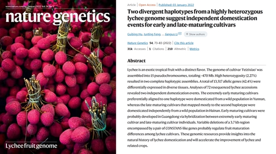 今年1月,团队李建国教授等牵头完成了“妃子笑”荔枝基因组假染色体水平的组装,解开了荔枝起源驯化的历史之谜,同时对荔枝栽培品种来源和开花调控机制等生物学问题进行了深入解析,相关成果发表在国际权威学术期刊。