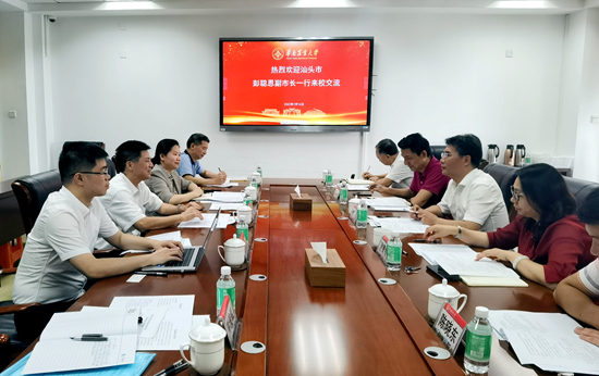 7月14日下午,汕头市副市长彭聪恩一行来我校调研交流。校党委常委、副校长钟强接待来宾并在行政楼六楼中会议室进行座谈。双方围绕科技成果转化、人才输送、产学研项目共建等进行了深入交流。