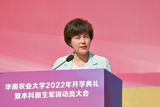 “同学们,能够成为新时代的一名大学生,能够成为华南农业大学的一员,你们是幸运而光荣的,是非常值得自豪的。这份自豪,源于你们自身的优秀,源于你们特别的身份,源于你们的使命。”刘雅红以《不负时代 不负青春 努力成长为堪当民族复兴重任的一流人才》为题作新生寄语讲话。她指出,作为华农入选国家“双一流”建设高校后招收的第一届新生,今年的新生在各方面都很优秀,有理想、有拼搏;同时,作为新时代的中国青年,大家还肩负着实现中华民族伟大复兴的历史使命。通过老一辈华农人的感人事迹、学校近年来“争创一流”取得的新成绩,刘雅红激励同学们努力学习掌握科学知识、提高内在素质、锤炼过硬本领,不负时代,不负青春,踔厉奋发,勇毅前行,努力成长为堪当民族复兴重任的一流人才,努力成长为锐不可当的中国力量。