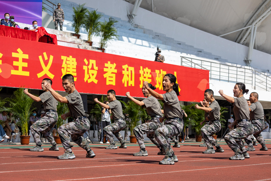 军训教官代表发言结束后,华南农业大学军训教官团为全场师生带来了军事科目表演:分队队列动作和军体拳表演两个科目。主席台前的跑道上,教官们精神饱满、斗志昂扬,动作准确、步伐矫健,充分展现了军训教官团良好的精神面貌、过硬的军事技能和严格的纪律作风。