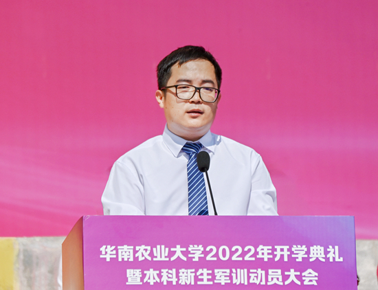 教师代表、国家自然科学基金优秀青年基金获得者、植物保护学院张彤副教授代表学校全体教师向加入华农大家庭的新同学们表示热烈欢迎和衷心祝贺。“用知识服务社会、用行动承担责任,这是华农人的品格。”结合自己求学、工作的多年经验,张彤表示,希望同学们心怀“国之大者”、树立家国情怀,练就过硬本领、奋斗精彩人生,积极开拓进取、勇于战胜挫折,成为一名知农、爱农、强农、兴农的新时代青年,“期待几年后你们参加毕业典礼时,可以告诉自己,你已经成长为一名骄傲的华农人!”