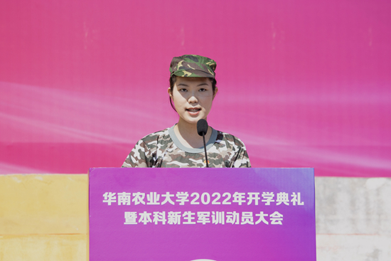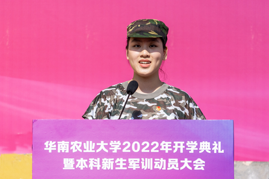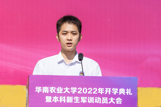 “高考填报志愿时,我义无反顾地选择了报考华南农业大学,希望在未来能为乡村振兴贡献自己的力量,让更多的乡村走向富裕,走向美好的明天!”来自公共管理学院2022级公共管理类专业的钟颖同学代表本科新生上台发言。她分享了自己家乡脱贫致富的故事,表达了自己考上华农的激动心情。“作为学校进入国家‘双一流’建设行列以来招收的首批本科新生,我们要谨记‘修德、博学、求实、创新’的校训,砥砺青春,做有理想、敢担当、能吃苦、肯奋斗的时代新人!”她号召每位新生以高远志气立心、以浩然骨气立命、以深厚底气立业,为乡村振兴战略和实现中华民族的伟大复兴贡献智慧和力量。