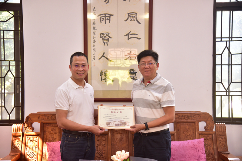 校友会(教育发展基金会)有关负责人与陈尧海签订捐赠协议。咸春龙为陈尧海颁发捐赠证书和牌匾。