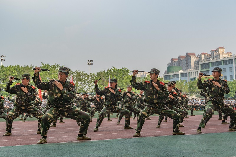 同学们精神状态饱满,军容风纪严整,口号高亢嘹亮,步伐整齐划一,充分展现了华农学子风范,展示了军事技能训练成果。队列、匕首操、格斗基本功、军体拳、刺杀操、战术表演等六个汇报展示科目,动作铿锵有力、一气呵成,场面气势磅礴,一招一式尽显果敢、坚毅与自信,赢得了现场师生的阵阵掌声。