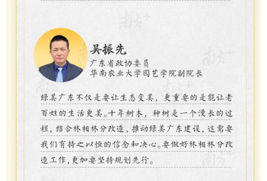 我校园艺学院副院长、民盟委员会主委吴振先认为绿美广东不仅是要让生态变美,更重要的是能让老百姓的生活更美,呼吁广东各地要做好林相林分改造工作,更加要坚持规划先行。南方+《献计高质量发展,省政协委员们提出这些“金点子”》、南方日报《“美”了生态 也“美”了百姓生活》等关注报道。