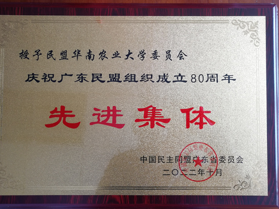 民盟华南农业大学委员会获得“庆祝广东民盟组织成立80周年先进集体”荣誉称号(全省35个);动物科学学院教授毕英佐、兽医学院教授刘健华、园艺学院教授陈维信、林学与风景园林学院教授唐明、农学院教授储成才等5人获得“杰出盟员”荣誉称号(全省30名);工程学院教授马瑞峻获得“优秀盟员”荣誉称号(全省80名)。