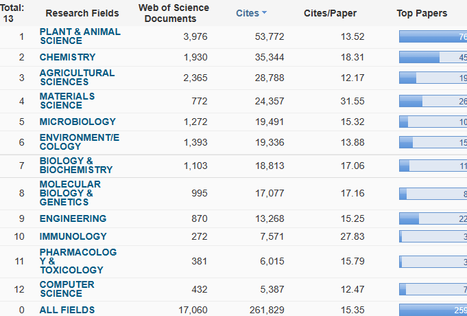 本期我校仍保持12个ESI学科进入全球前1%,无新增学科。12个学科与上一期相同,分别是:植物学与动物学、化学、农业科学、材料科学、微生物学、环境科学与生态学、生物学与生物化学、分子生物学与遗传学、工程学、免疫学、药理学与毒理学、计算机科学(依被引次数排序,图1)。