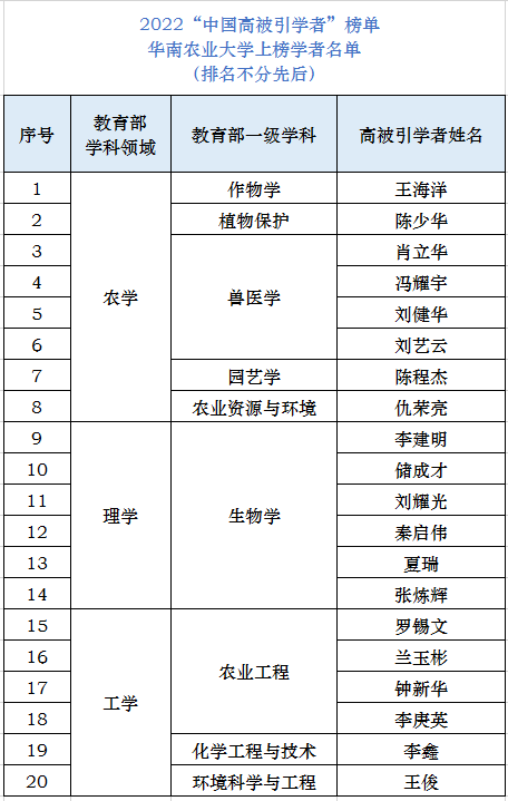 本次榜单共有来自全国504所高校、企业科研机构的5216名学者上榜,我校上榜人数位居全国高校第57名。榜单覆盖了教育部10个学科领域、84个一级学科,我校上榜的20位学者分布在农学、理学、工学学科领域,涉及兽医学、作物学、园艺学、农业资源与环境、植物保护、生物学、农业工程、化学工程与技术、环境工程与技术等9个教育部一级学科。