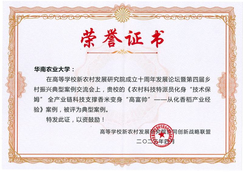 我校科技团队在从化创建了富有地方特色的“稻本香”高端丝苗米品牌,并指导示范地区申报国家地理标志产品和认定“广东丝苗香米”品牌,销售价格平均提升2倍以上,从3元/斤增加到6-40元/斤,稻农单亩每年纯收入增加1000元以上,促进全区水稻年收入增加约3.6亿元,经济、社会和生态效益显著,助农、带农和富农作用明显,形成了《农村科技特派员化身“技术保姆” 全产业链科技支撑香米变身“高富帅”——从化香稻产业经验》这一乡村振兴优秀案例。