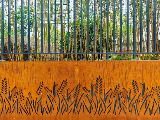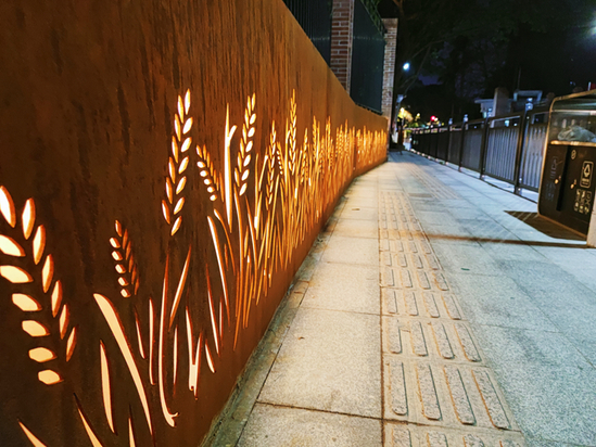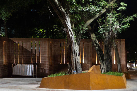 本次西门升级改造设计方案旨在传承和弘扬华农的百十年文化,基于学校老建筑的红墙绿瓦风貌与民国装饰风格,在设计上进行了简化与再现:一是景墙和围栏主体都采用红砖材料,同时立面点缀绿琉璃装饰,与历史建筑的琉璃瓦呼应;二是采用稻穗光景照亮道路,在解决夜晚照明的功能基础上呼应校园文化;三是使用耐候钢板营造树池,为大榕树提供生境的同时,还能节约出空间用以建设西门林荫广场。