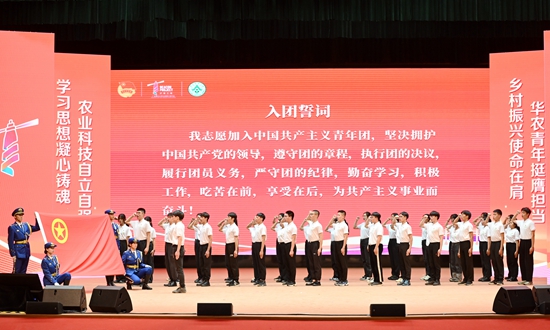 “我志愿加入中国共产主义青年团,坚决拥护中国共产党的领导,遵守团的章程,执行团的决议,履行团员义务,严守团的纪律,勤奋学习,积极工作,吃苦在前,享受在后,为共产主义事业而奋斗!”50余名新团员代表在台上面向团旗,举起右手庄严宣誓。