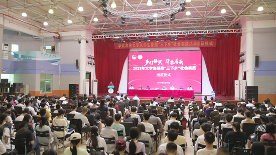 “乡村振兴 华农有我”2023年大学生暑期“三下乡”社会实践活动出征仪式近日在我校华山学生活动中心举行。今年,我校“三下乡”以“乡村振兴”为主线,开展“百千万工程”突击队、驻镇帮镇扶村、“青马工程”、“永根班”、教育帮扶、博士团、“百校连百县兴千村”、资助政策下乡行等品牌专项社会实践活动,近5000名师生将走出校园奔赴全国各地,用脚步丈量祖国大地,用眼睛发现中国精神,在社会大课堂中书写最美青春。