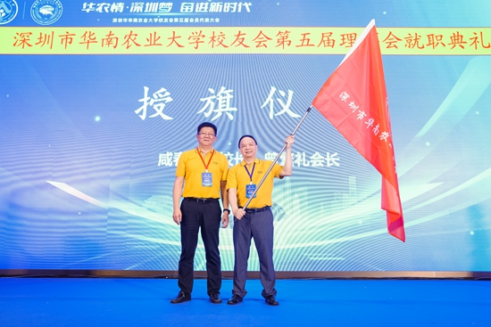 第五届理事会就职典礼上,咸春龙为深圳校友会授旗,与会领导嘉宾为第五届理事会成员颁发聘书。