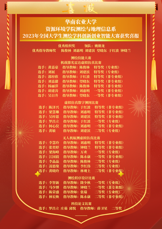 近日,在中国测绘学会教育工作委员会主办的2023年全国大学生测绘学科创新创业智能大赛中,我校师生取得佳绩,共荣获特等奖10项、一等奖8项、二等奖7项,陈俊林、刘惠明、刘建滨、于红波、钟晓兰和望晓东六位老师获得“优秀指导教师”,我校获专业组“优秀组织奖”,在全国参赛的211所院校中排名第三。