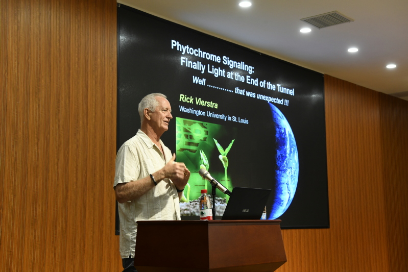 Richard Vierstra教授作了题为“Phytochrome Photoactivation and Signaling: Finally Light at the End of the Tunnel(光敏色素的光激活和信号传导:隧道尽头终有光)”的学术报告,并与现场师生交流互动,报告会学术氛围浓厚,气氛热烈,深受师生欢迎。