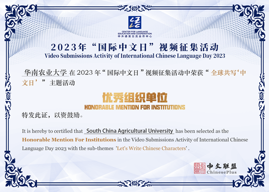 近日,我校在教育部中外语言合作交流中心(简称“语合中心”)主办的2023年“国际中文日”视频征集活动中荣获“全球共写‘中文日’”主题活动优秀组织单位奖。
