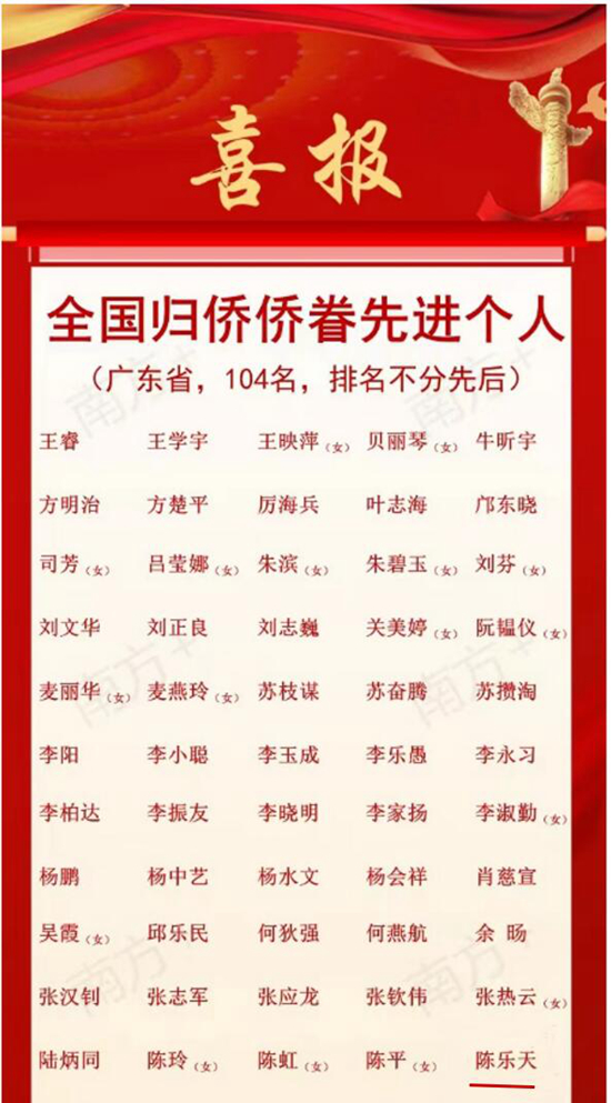 陈乐天教授曾留学日本,2010年底回到华南农业大学,挑起科教报国的重担。他聚焦水稻杂种优势利用技术瓶颈相关性状所蕴含的重大基础科学问题,主持了国家自然科学基金重点项目等课题20余项;在国际著名学术期刊发表论文80多篇,累计SCI影响因子760多分;授权国家发明专利10项,为我国杂交稻的可持续发展提供了理论基础和技术支撑,为我国粮食安全做出了突出贡献。陈乐天教授自2020年7月起担任校侨联主席,带领学校侨联积极探索“地方侨联+高校侨联+校友会”的工作模式,发挥高校侨联优势助力乡村振兴战略,建立起“党建带侨建、侨建为党建”的工作方法,在中国侨联推进全国高校侨联建设工作经验交流会上,代表广东高校作经验分享报告。