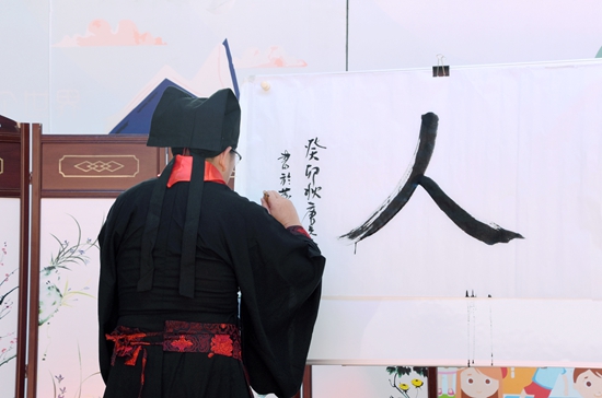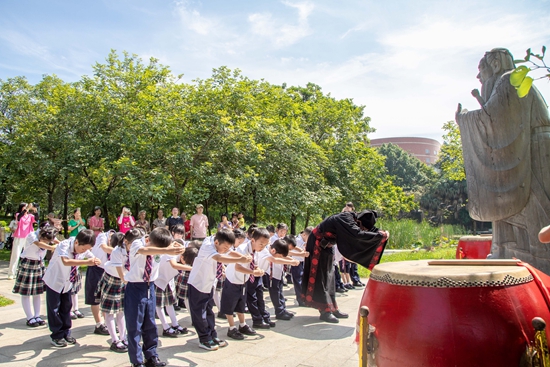 开笔启智慧,知礼润童年。在开笔礼上,唐元平老师身着汉服,用书法文化为小朋友们作启蒙。他现场书写了 “人”字,讲解了一撇一捺的深远含义,勉励同学们尊师孝亲,努力成长,做一个顶天立地的人。开笔礼完毕后,老师们在教室里为一年级新生点朱砂,教写人字帖。随后,唐元平老师带领一年级新生前往湿地公园,在孔子像前行拜礼,并击鼓明志,表达“一击鼓,敬师长;二击鼓,习礼仪;三击鼓,勤学习”的决心。