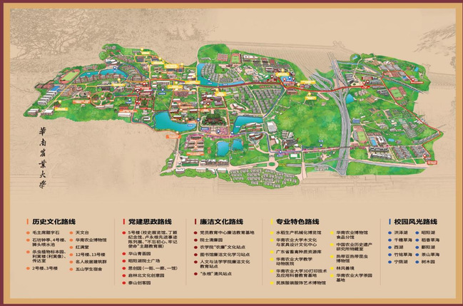 “五湖四海一片林”的紫荆校园,是华农人的生活家园。学校充分挖掘校本育人资源,结合校园自然景观、历史景观和功能定位,加强对学校各个历史时期办学点的历史考证研究、“中国地图式校园布局”匠心设计的挖掘研究和阐释,打造有影响力的文化站点和文化集群,分步骤建设历史文化、党建思政、廉洁文化、专业特色、校园风光等5条校园文化路线,让华农校园更有文化底蕴和历史厚度。
