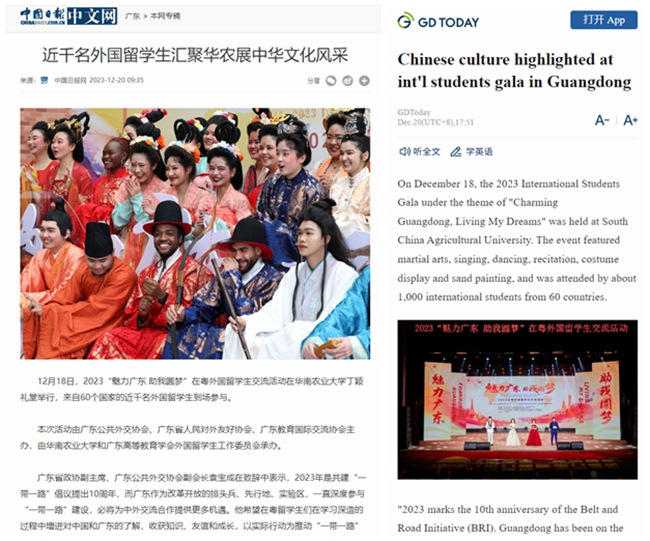 此外,学校还积极推动中外文明交流互鉴,举办承办“国际中文日”文化体验沙龙、“魅力广东 助我圆梦”在粤外国留学生交流活动等校园文化活动,弘扬中国文化魅力,在国际交流中壮大华农声音。