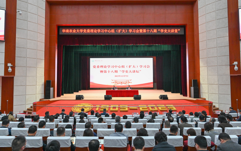 学校聚焦主题教育,强化理论武装,推进党委理论学习中心组学习与主题教育读书班相融合,打造班子领学、个人自学、专家讲学、调查研学、岗位践学的“五学联动”学习机制,全年组织开展学校党委理论学习中心组集中学习14场,组织中心组成员赴中国国家版本馆广州分馆等地开展调查研学3场,举办“学史大讲坛”专题辅导报告6场。持续深入实施“1+6+N”宣讲行动,华南农业大学理论宣讲团入选广东首批基层示范宣讲队,是全省唯一一家入选的高校。