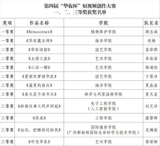 5月24日晚,为期两个多月的第四届“华农杯”短视频创作大赛落下帷幕,经现场专家评委团和学生评审团打分与投票,并结合前期网络投票结果,作品《Renascence》和《华农魔法师》获一等奖,《华农诗韵》等4件作品获二等奖,《盛夏的独白》等6件作品获三等奖。此外,《我与华农的二十四小时》等15件作品被评为优秀奖。今年还增设“招生宣传专项奖”,从“我的专业我代言”主题中遴选出的《心动一瞬》等10件作品获奖。材料与能源学院、电子工程学院(人工智能学院)、海洋学院、林学与风景园林学院、艺术学院、园艺学院、植物保护学院被评为“最佳组织奖”。