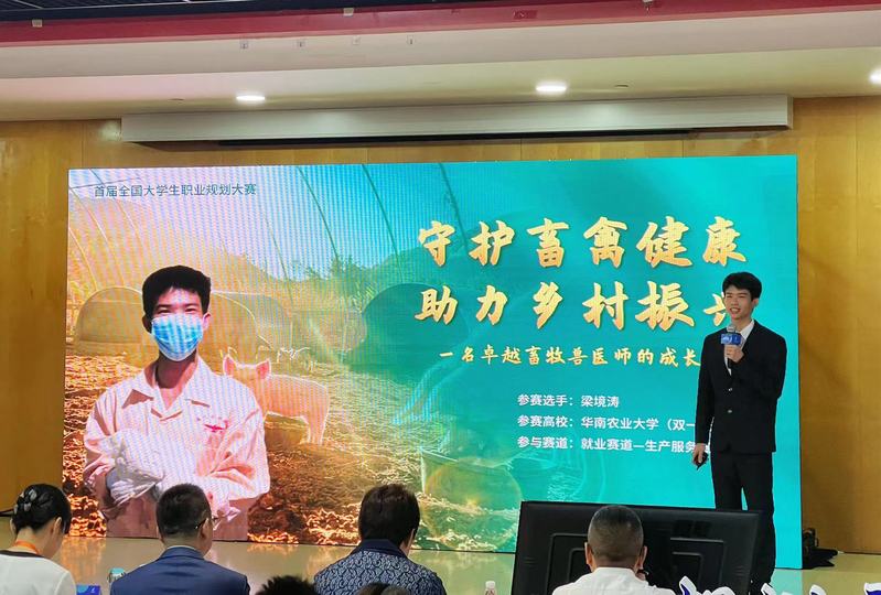 本次比赛,梁境涛同学以“守护畜禽健康,助力乡村振兴”为题,展示了自己目标成为一名卓越畜牧兽医师的成长之路。梁境涛生于农村,从小对动物饲养产生极大兴趣,他见识过非洲猪瘟等传染病对畜禽健康的巨大影响,也关注到我国畜牧行业乡村人才需求量大、生产成本高、疾病防治难的痛点,高考后便以第一志愿报考我校动物医学专业。大学期间,他紧密围绕目标岗位要求,磨练职业能力,专业课成绩优异,参与国家级大学生创新创业训练项目,制作关于禽类疾病、品种、养殖管理的短视频科普教学,视频播放量达2.5万,点赞数超1000;参加华南兽医猪病诊疗大赛获团体一等奖,躬身乡村一线,前往多家公司参与实习,进行畜禽免疫管理与疾病预防、救治工作。
