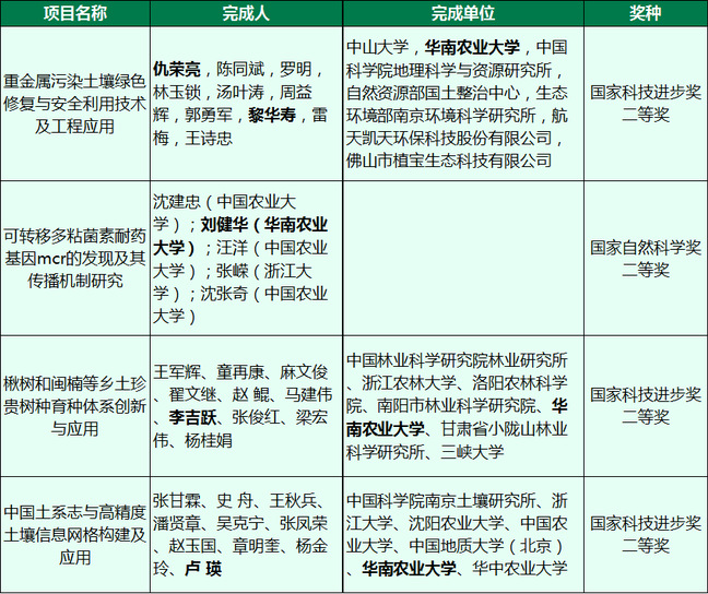 资源环境学院仇荣亮教授作为第一完成人、黎华寿教授作为第八完成人共同完成的项目“重金属污染土壤绿色修复与安全利用技术及工程应用”获国家科技进步奖二等奖。该项目基于重金属定向调控修复理论,研发了高效稳定的生态修复技术、减污增产的植物修复技术以及绿色靶向的化学修复技术,形成了覆盖金属矿山、污染农田和工业场地的安全利用技术模式。在全国二十余个省(市/自治区)应用。先后入选国家“十二五”、“十三五”科技创新成就展、广东省“十三五”农业科技十大标志性成果,为全球土壤污染修复及环境管理提供了中国方案。