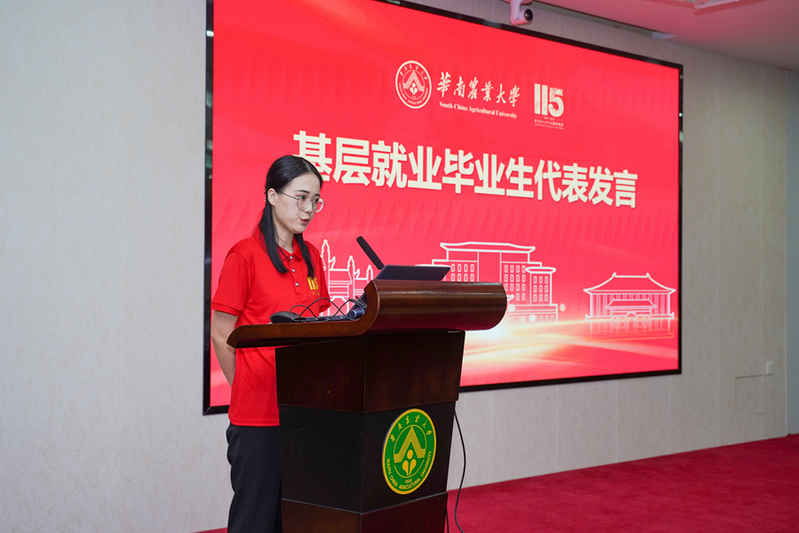 丁红星向即将奔赴祖国基层就业的毕业生表示祝贺,充分肯定了同学们“祖国的需要就是我的志愿”的价值追求。他向同学们提出了三点希望:一是要胸怀“国之大者”,挺膺担当,砺炼青春,展现华农人自信自强、刚健有为的精神风貌;二是要牢记“创新担当”,发挥自己的专业特长,用自己所学,为解决基层的实际问题、出谋划策;三是要不忘“初心使命”,要学会倾听、学会理解,学会与同事们团结协作,共同攻克难关,以实际行动去践行使命担当。