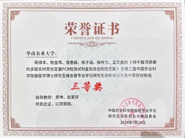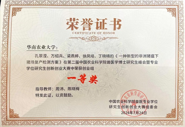 其中,周沛、陈晓梅老师指导的项目《一种新型的非洲猪瘟下猪场复产检测方案》荣获创业组一等奖,贾坤、赵夏琼老师指导的项目《犊牛腹泻病毒的多联实时荧光定量PCR检测试剂盒及综合防控方案》荣获创新组三等奖,张建民老师指导陈凯风同学的学术报告《BoIA在鼠伤寒沙门菌多细胞行为产生中的作用机制研究》荣获学术报告三等奖。赛前,兽医学院邀请专业老师多次指导比赛,组织队伍参与数轮的打磨和培训,从路演、礼仪及答辩各方面为学生提供专业的建议和指导。