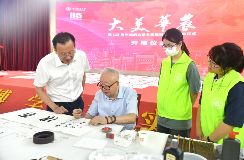 开笔仪式上,嘉宾们围绕“大美华农”主题,以华农校训、丁颖精神、校园美景等内容为灵感来源,挥毫泼墨、妙笔生花,即兴创作、相互“切磋”。不少师生在一旁驻足欣赏,不时发出赞叹;或是主动上前,向名家们请教学习。现场翰墨飘香,气氛热烈。