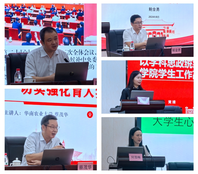 华南师范大学马克思主义学院党委书记胡国胜教授作了题为《为中国式现代化提供强大动力和制度保障——党的二十届三中全会精神解读》的报告,他联系学生工作实际,对进一步全面深化改革、推进中国式现代化进行了系统的解读和阐释。学校公共管理学院党委书记蔡茂华作了题为《优化学院学生党建工作体系,切实强化育人实效》的报告,从明确定位、带强队伍、做实业务三个方面,讲授提升学生党建工作的思路方法。学校党委学生工作部(党委研究生工作部)部长鲍金勇作了题为《“一站式”学生社区建设视角下的辅导员队伍建设》的报告,从“一站式”学生社区建设对学生工作的启示切入,系统阐释了辅导员工作的新要求。中山大学物理学院党委副书记黄婧作了题为《以学科思政统筹推进学院学生工作高质量发展》的报告,分享了学科思政格局下如何开展院系学生工作。华南师范大学团委书记何雪梅作了题为《大学生心理育人网格化体系建设》的报告,分享了用爱和智慧构建心理育人网格化体系的经验做法。