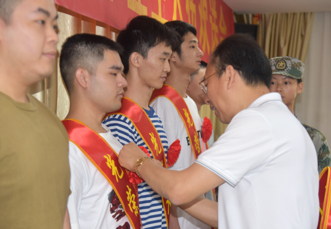 校党委书记李凤亮为入伍学生代表佩戴“光荣入伍”授带和胸花