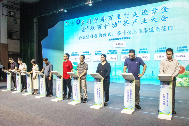 活动现场为10名专家学者受聘为紫金县“百千万工程”专家智库成员,京东渠道商与紫金当地8个茶企签订了合作协议,还开展了茶艺秀表演与品鉴、优质茶叶品牌展等活动,全面展示了紫金茶产业的发展成果。
