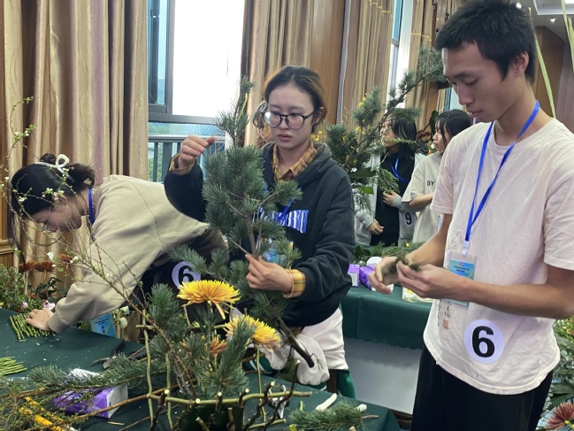 插花艺术是园艺专业的重要技能,也是锻炼学生发现自然之美、感受生活之趣的美育教育的途径。本次大赛以“花语心声”为主题,涵盖“花样校园”“传统与现代对话”“心灵之美”、“和谐共生”四个方面,共有来自省内12所高校的29支队伍参赛。各参赛队伍紧扣赛事主题进行了插花创作,现场气氛紧张而热烈,经过集体构思、花材选择、材料修剪、颜色搭配、空间造型等不同流程,创作出创意十足的插花艺术作品,体现了对自然和和谐的认识和对美好生活的向往。
