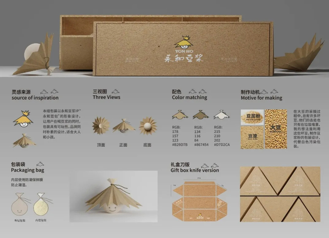 “在大豆的采摘过程中,总有许多坏豆,他们的去处也只有在垃圾堆里,我的想法是利用这些坏豆,制作豆浆粉的包装设计,代替白色污染包装。”全球金球奖作品、艺术学院吴卓聪《以“和”为礼》以知名豆浆IP形象作为原型设计包装,采用豆渣作为制作材料,可回归土壤降解。内层使用防潮保鲜膜,防止潮湿,外层采用棉麻布料包装,更加贴合永和豆浆整体的调性,让用户在喝豆浆的同时,包装具有可玩性。