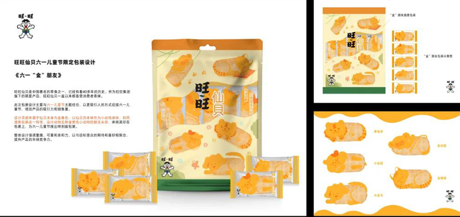 全球金球奖作品、艺术学院张芊彤同学《六一“金”朋友》,以六一儿童节为主题,将仙贝的本体作为小动物身体,在透明包装上印上五种金黄色小动物四肢及头部,设计充满童趣,富有亲和力。