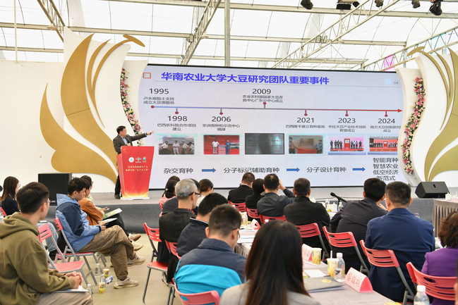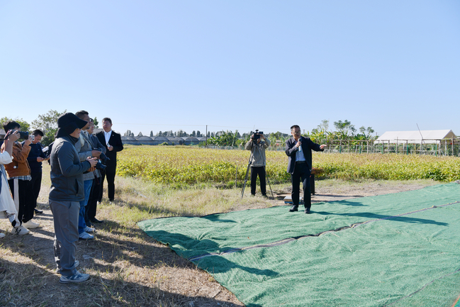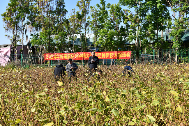 华农南方大豆研究院专家、农学院年海教授现场介绍了南海区里水镇复耕地与狮山镇撂荒地大豆种植情况。据介绍,佛山市南海区里水镇南方大豆品种繁育示范基地前期为绿化苗种植地,经历土壤表层移除后,地形崎岖不平,一度失去农作物种植条件。2022年,该地块转型为大豆育种基地,选育华农最新大豆品种“华夏24”,并配套了高效的栽培技术集成,包括全程机械化起垄、播种、收割,无人机喷药,自主研发复合菌肥,豆秆黑潜蝇防治等。佛山市南海区狮山镇种植基地原为撂荒地,选用华农培育的高产品种“华夏21”,分别于今年9月3日和9月26日两批次播种,采用里水基地同样的种植模式,预计将于12月30日迎来收获期,即将实现复耕地冬种大豆高产高效种植目标。