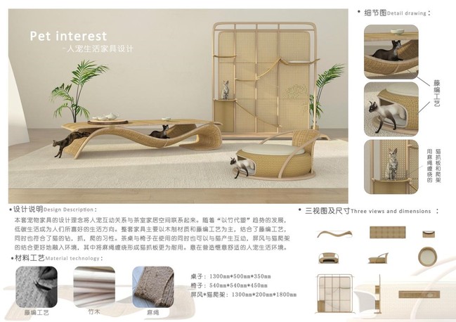 林昕薏的作品《宠趣》由陈哲老师指导,以人宠互动为核心,旨在打造低碳、舒适的茶室空间。作品巧妙地融合实木与竹编工艺,细致入微地考虑到猫的生活习性,从而实现了人与宠物之间的和谐共处。在设计中,竹编茶台和茶椅不仅承载着猫窝的功能,还巧妙地为宠物提供了钻、抓、爬的互动空间。此外,麻绳缠绕的猫抓板在满足实用性的同时,也不失为一件美观的家居装饰品。