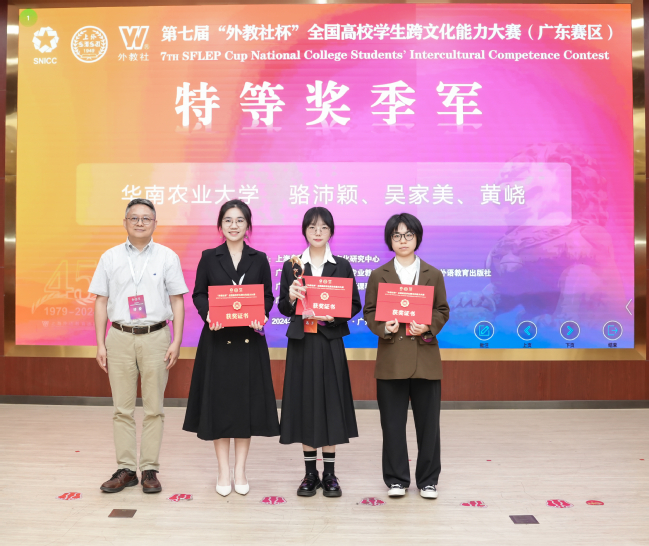 近日,第七届“外教社杯”全国高校学生跨文化能力大赛全国决赛暨总决赛在上海外国语大学(虹口校区)举行。由英语专业2022级骆沛颖、金融学(CFA)专业2022级吴家美、地理信息科学专业2022级黄峣组成的华南农业大学代表队(指导老师:李宇庄、李雅、米亮琴)与来自北京大学、复旦大学、南京大学等高校的64支学生队伍同台竞技。我校选手凭借生动的案例展示、清晰的文化冲突分析和扎实的跨文化理论解读,最终获得全国一等奖的优异成绩。