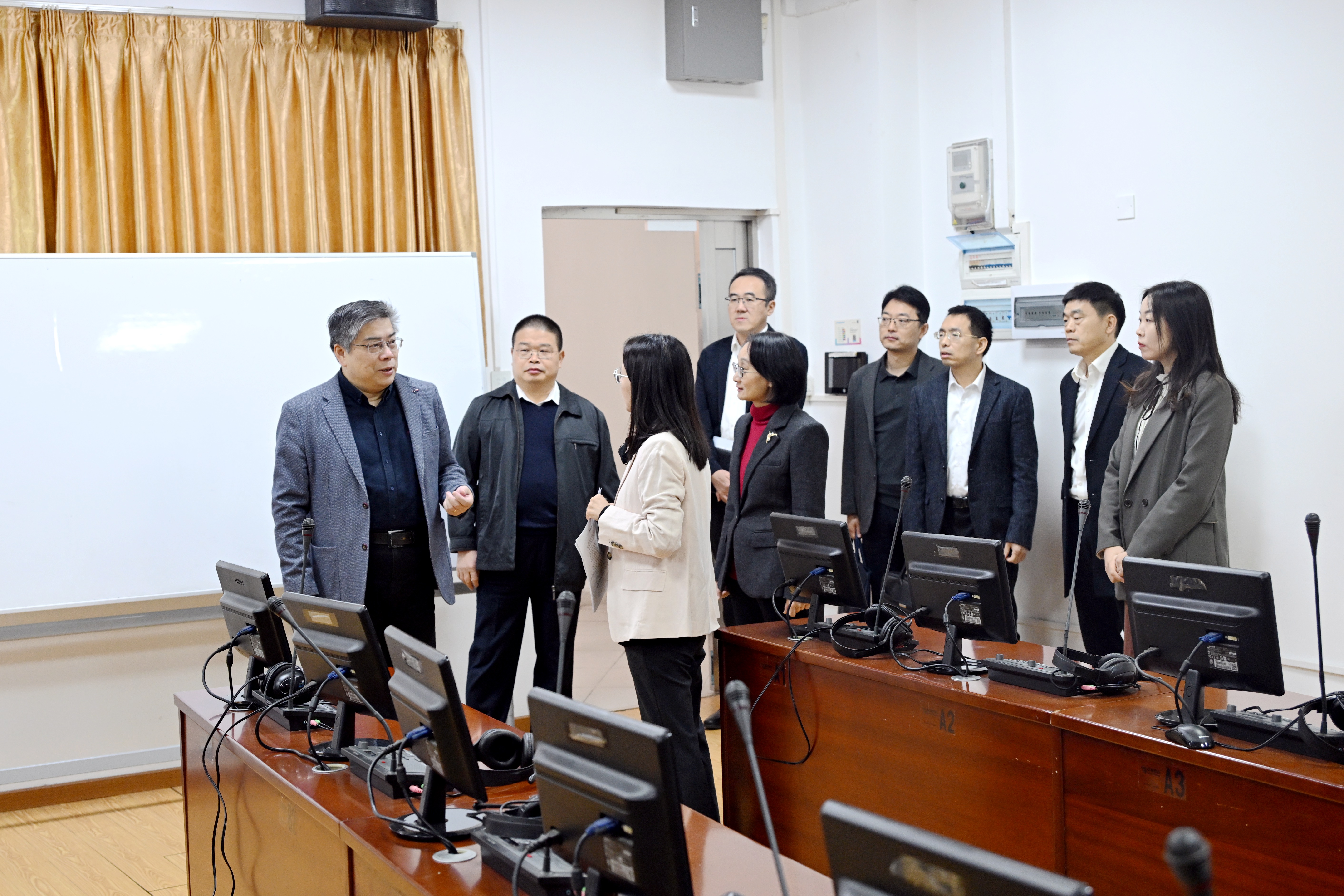薛红卫实地调研了学院同声传译实验室、跨境电商实训室,并听取学院工作汇报。他对学院党建工作、学生工作、公共外语教学和国际化建设等方面工作与成效给予肯定,并结合学校“十五五”规划编制和“双一流”建设,对学院下一步发展提出四点要求:一是明确发展目标,凝练学科优势特色。学院要围绕基础化、多元化、专业化和特色化进一步明确学院目标定位,加强“学院-学科-学位点-专业”一体化建设,加快推进一级学科建设,衔接行业发展需求,推动科研反哺教学。二是多方通力合作,建立一流师资队伍。要系统分析师资队伍存在的问题和发展需求,引育并举,多元施策,以更开放的模式建设好人才队伍。三是做好系统布局,支撑学校国际化建设。结合学校“十五五”规划编制和国际化发展战略导向,推进学院国际化建设,系统谋划,探索选育优秀学生、青年教师到国际组织实习任职,提升学校国际影响力。四是深化教学创新,夯实专业建设基础。注重AI赋能外语公共教学创新,优化完善微专业建设,着力推动复合型人才培养。