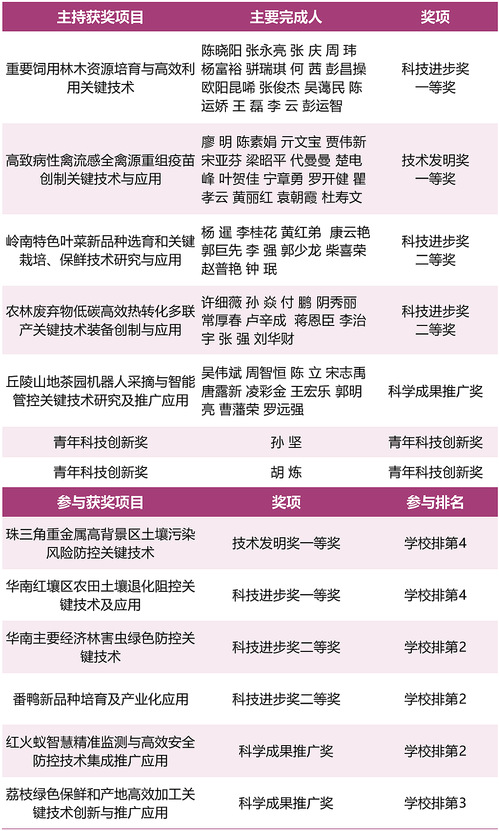 近日,广东省人民政府发布了2024年度广东省科学技术奖获奖名单,华农共13个项目(个人)获奖,主持7项、参与6项,其中,一等奖4项、二等奖4项、推广奖3项、青年奖2项。获奖项目聚焦农业关键技术与区域发展需求,展示了学校在林木遗传、动物疫病防控、智慧农业、绿色防控等领域的技术积累与推广实效,彰显学校在服务区域发展与推动农业科技自立自强中的扎实贡献。