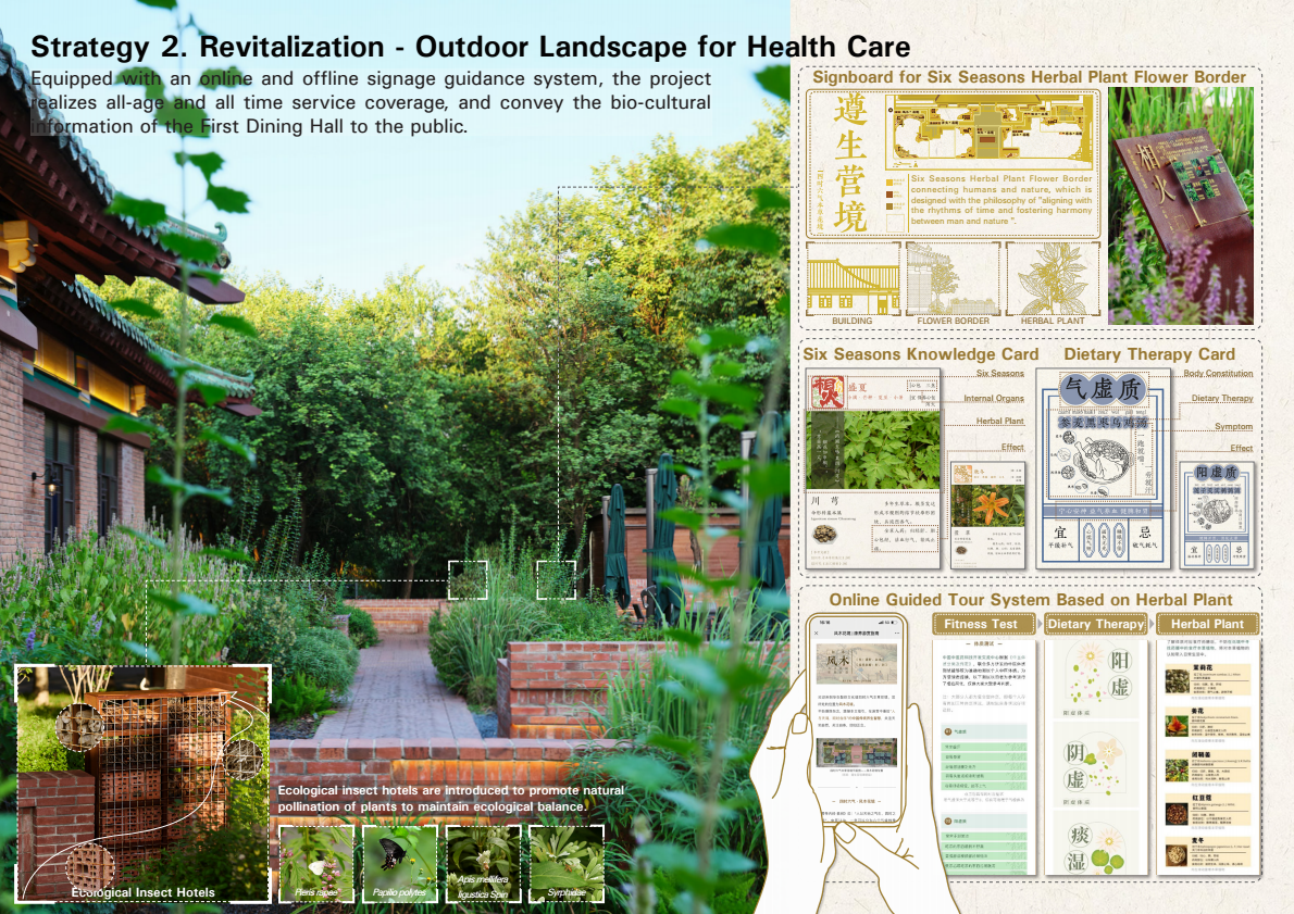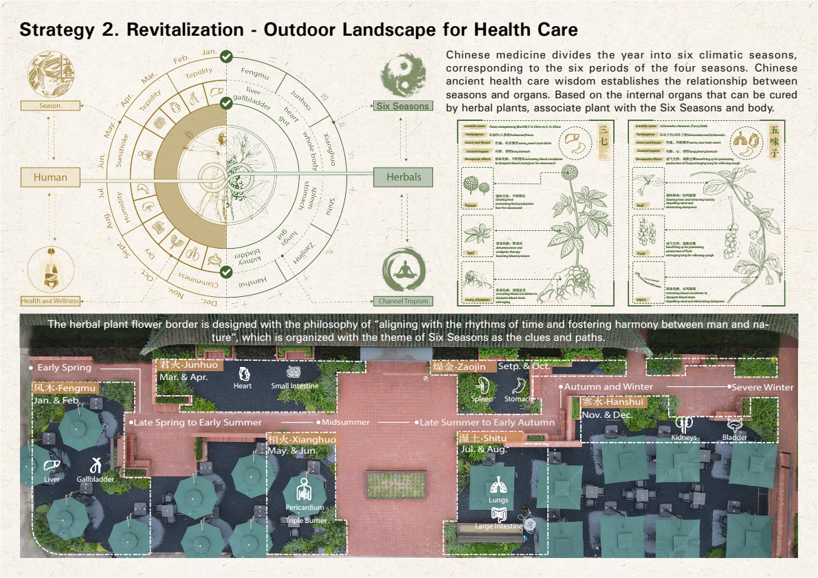 户外环境再生设计上,则以顺时合序、人与天调为原则,以四时六气为花境主题,选用岭南本草植物营造本草花境,并将植物(地)与四时六气(天)以及人体(人)关联起来,形成“天、地、人”相呼应的岭南本草植物疗愈空间,从西至东依时序布置六组“六气”主题花境,引导校园师生重拾中国传统养生智慧,回归人与天调、顺时合序的传统天人关系。