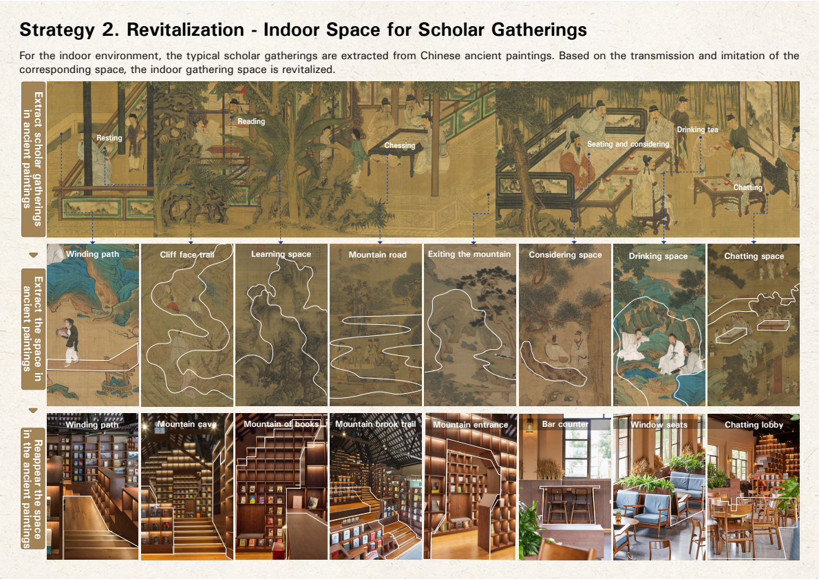 室内空间设计上,以风景园林手法介入建筑更新,将室内空间园林化,以“画意营境”为设计方法,以“藏书园林”为设计定位,基于对中国传统山水画中山川意象与中国古典园林假山空间的传移模写,打造多功能复合的室内“书山”。设计后的室内空间可利用率增加了三分之一,兼具行、望、居、游等综合功能,为校园师生提供了功能复合的室内文化生活空间。