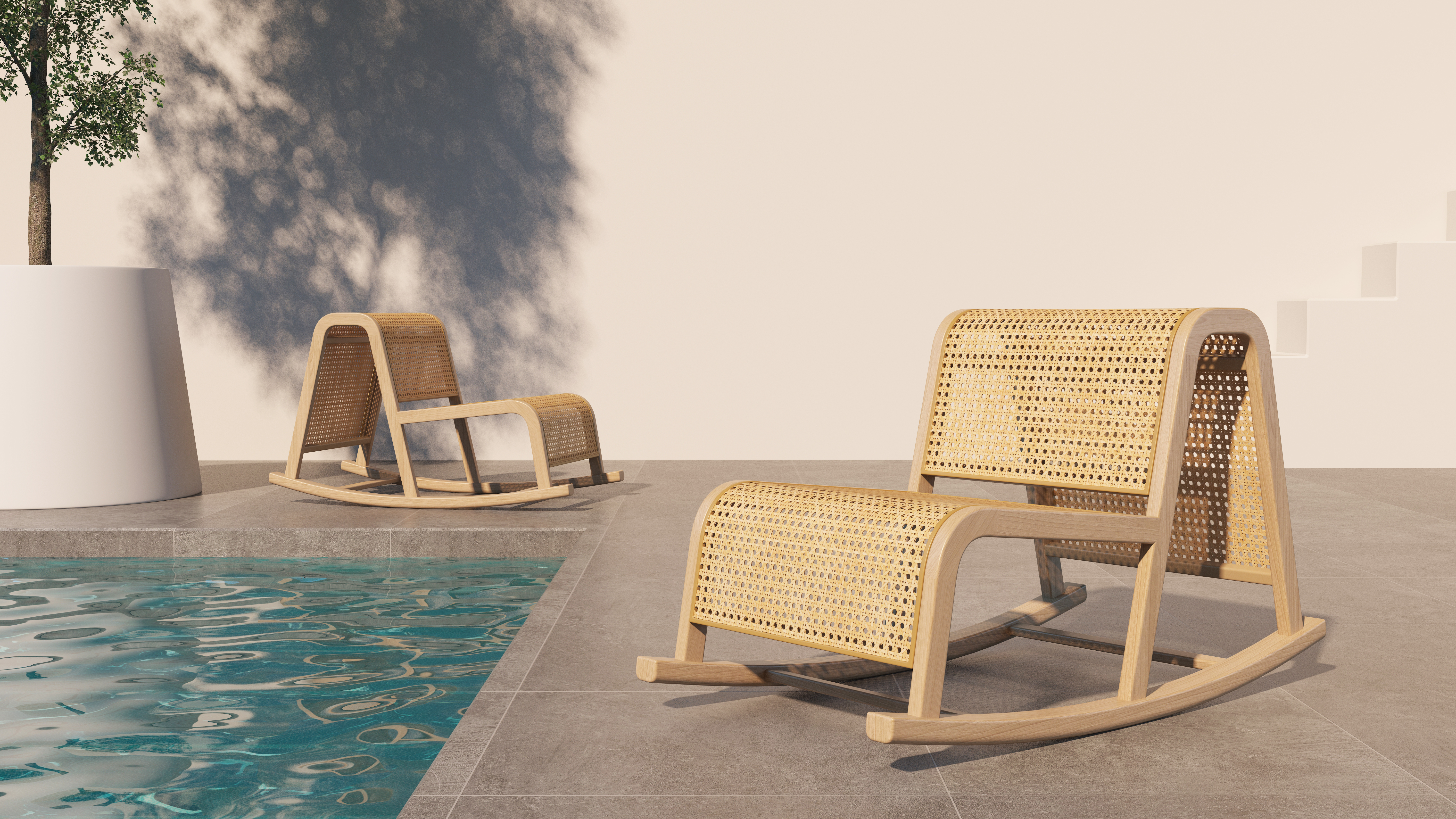 《望山椅》设计灵感源自中国传统"山"意象,融合自然元素与现代舒适。整体造型取山峦轮廓,线条刚劲。框架采用高支撑木材,座面与靠背运用八角藤编工艺,在保证功能性的同时,通过藤纹韵律展现山势肌理。宽大坐面配合精密计算的微摇弧度,营造山林沉浸体验,藤木材质摩擦声与支撑感共同唤醒自然禅意。