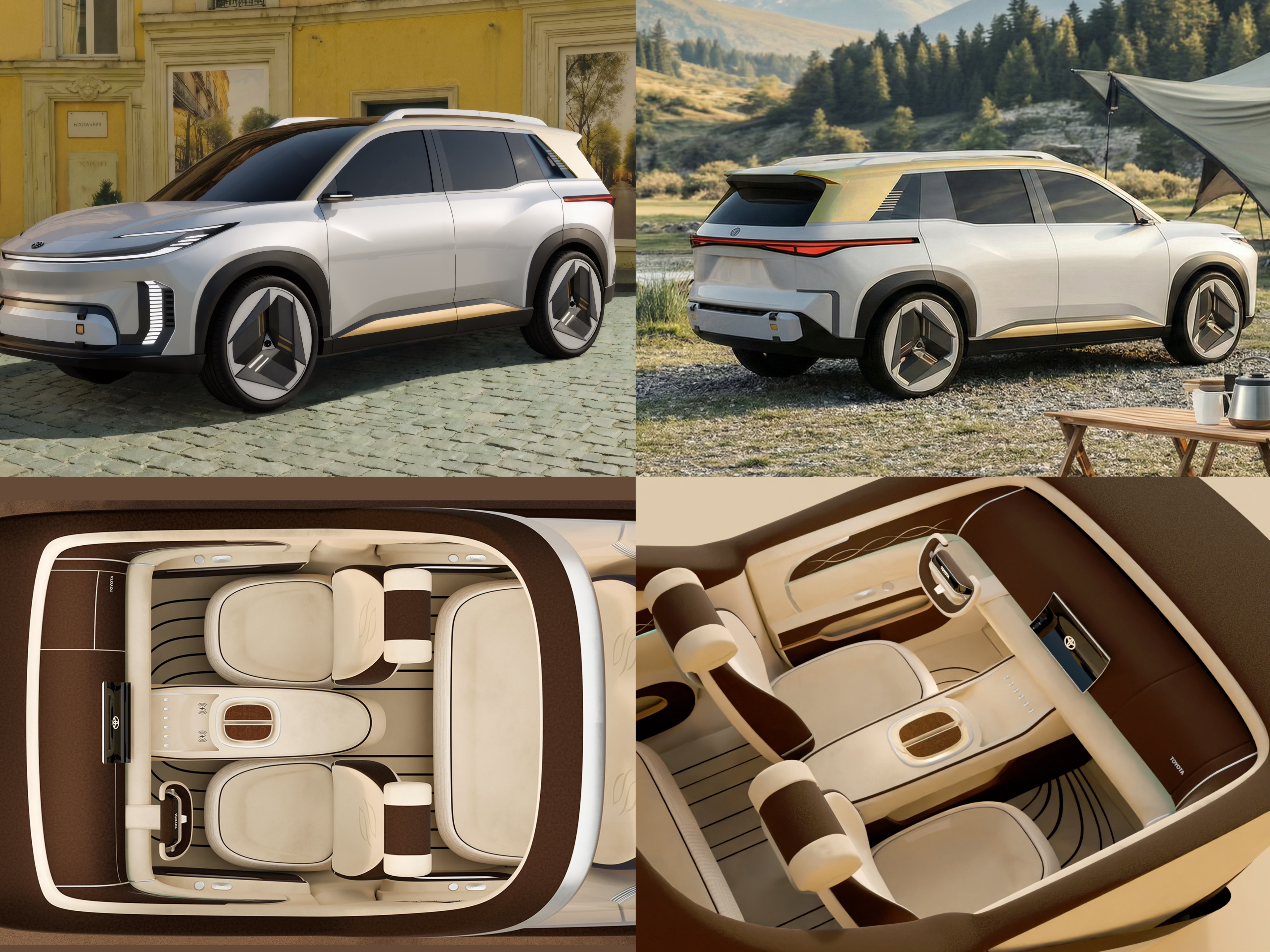 《COFFEE MATE》是一款面向注重理性与咖啡文化的年轻群体的铂智3X概念车设计,以“搭子社交”为核心理念,融合悦己体验与轻社交属性。车辆外观从咖啡豆与器具汲取灵感,呈现“静谧悬浮感”与流动曲面,前脸造型优化了丰田锤头鲨设计语言,侧面增强了Y字型腰线,尾部采用贯穿式尾灯设计,搭配咖啡烘焙色调,营造都市精致氛围。内饰以几何化咖啡豆元素构建模块化空间,融入定制小桌板与智能交互屏,强调层次与连贯感;面料采用了环保与触感兼具的CMF设计元素,门板配亲肤弹力绒与3D光影面料,座椅覆咖啡豆纹超纤皮,创新使用咖啡渣原料生物树脂淡香饰板。《COFFEE  MATE》挖掘了车辆在社交属性中的表达潜力,兼顾了视觉潮流感与使用功能性。